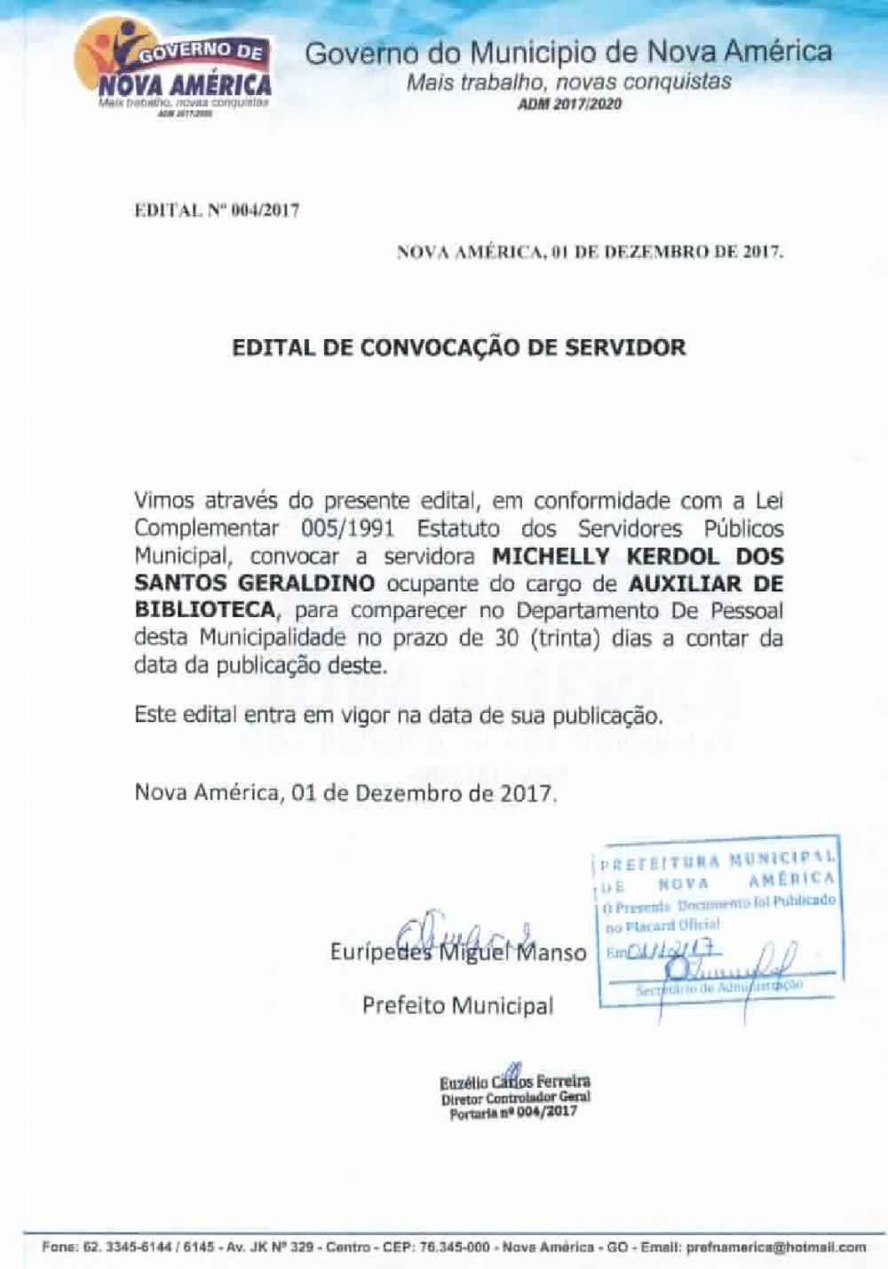 Vimos através do presente edital, em conformidade com a Lei complementar 005/1991 Estatuto dos Servidores Públicos Municipal, convocar a servidora Michelly Kerdol dos Santos Geraldino ocupante do cargo de Auxiliar de Biblioteca, para comparecer no Departamento de Pessoal desta Municipalidade no prazo de 30 dias a contar da data da publicação deste.